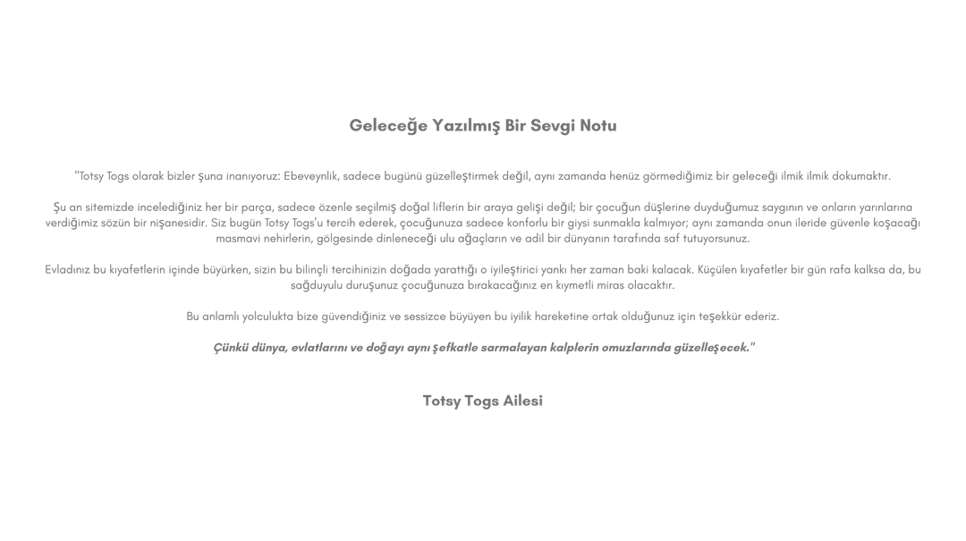 Totsy Togs, bir çocuk giyim markasından çok daha fazlası; çocuklarımızın geleceğine duyduğumuz sorumluluktan doğan bir iyilik hareketidir. Bizler, modanın hızla tükendiği bir dünyada, her ilmeği doğaya saygı ve çocuk şefkatiyle atılmış kalıcı bir alternatif sunmak için yola çıktık.